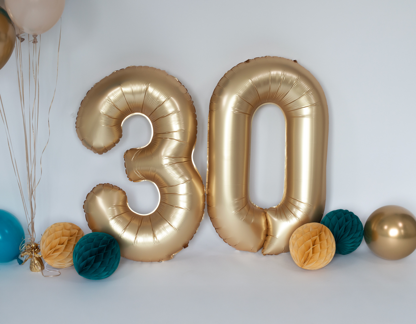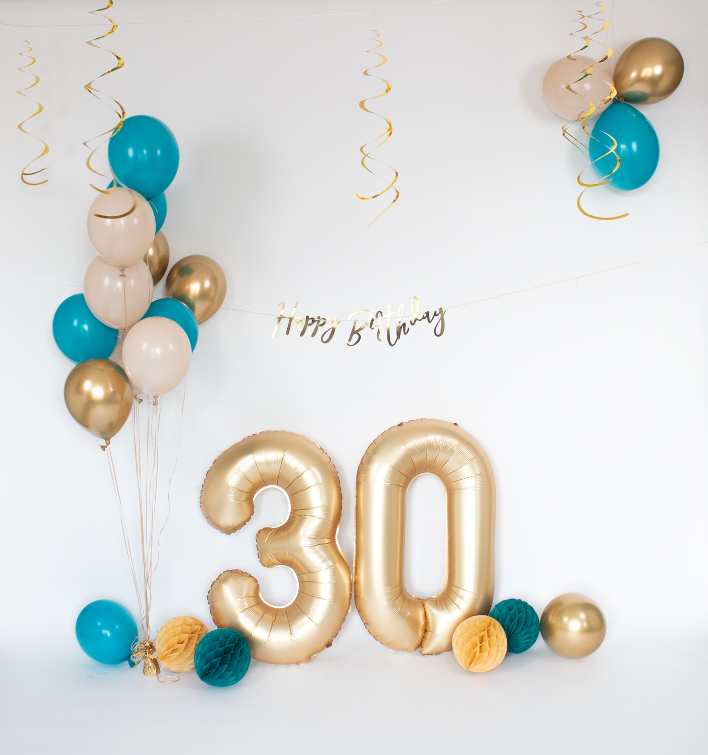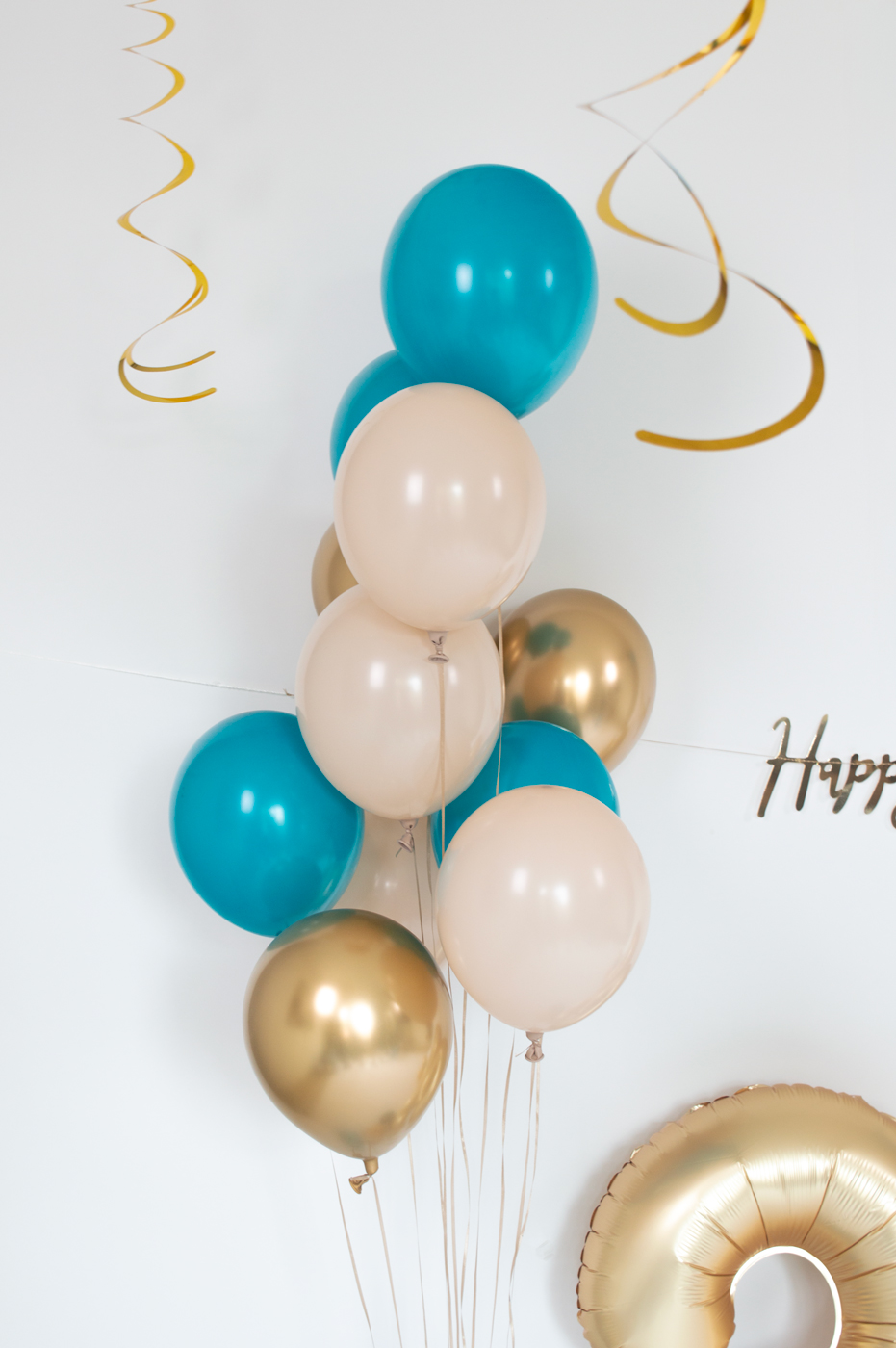 Een stijlvolle Happy Birthday cake topper die je taart of sweet table direct een luxe detail geeft. Een grote goudkleurige cijferballon, beschikbaar in elk gewenst nummer zodat het pakket geschikt is voor iedere leeftijd. Honeycombs in bijpassende tinten voor extra diepte aan je muur of backdrop. Een zorgvuldig samengestelde mix van matte ballonnen in lagoon blue, neutrale tinten en goud. Groot genoeg voor volume, rustig genoeg voor een elegante uitstraling. Krullint voor een nette afwerking. Lijmpuntjes waarmee je eenvoudig ballonnen combineert en volume opbouwt. Alles is al in verhouding samengesteld. Jij hoeft alleen nog te bepalen waar je het wilt plaatsen.