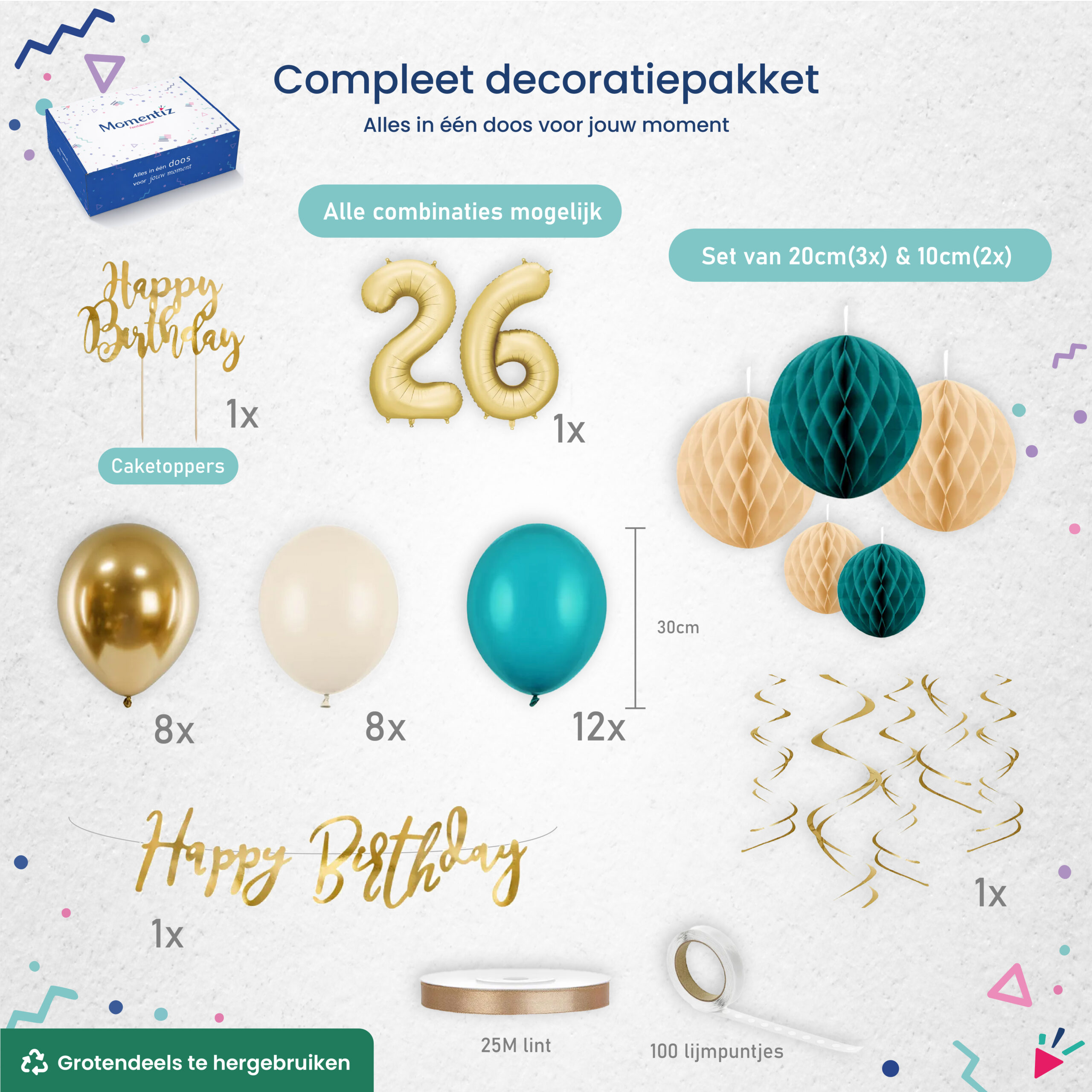 Veel onderdelen in dit pakket kun je opnieuw gebruiken bij een volgende gelegenheid. Honeycombs, folieballonnen en diverse decoratieve elementen blijven mooi.