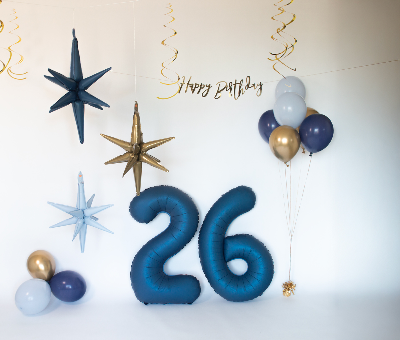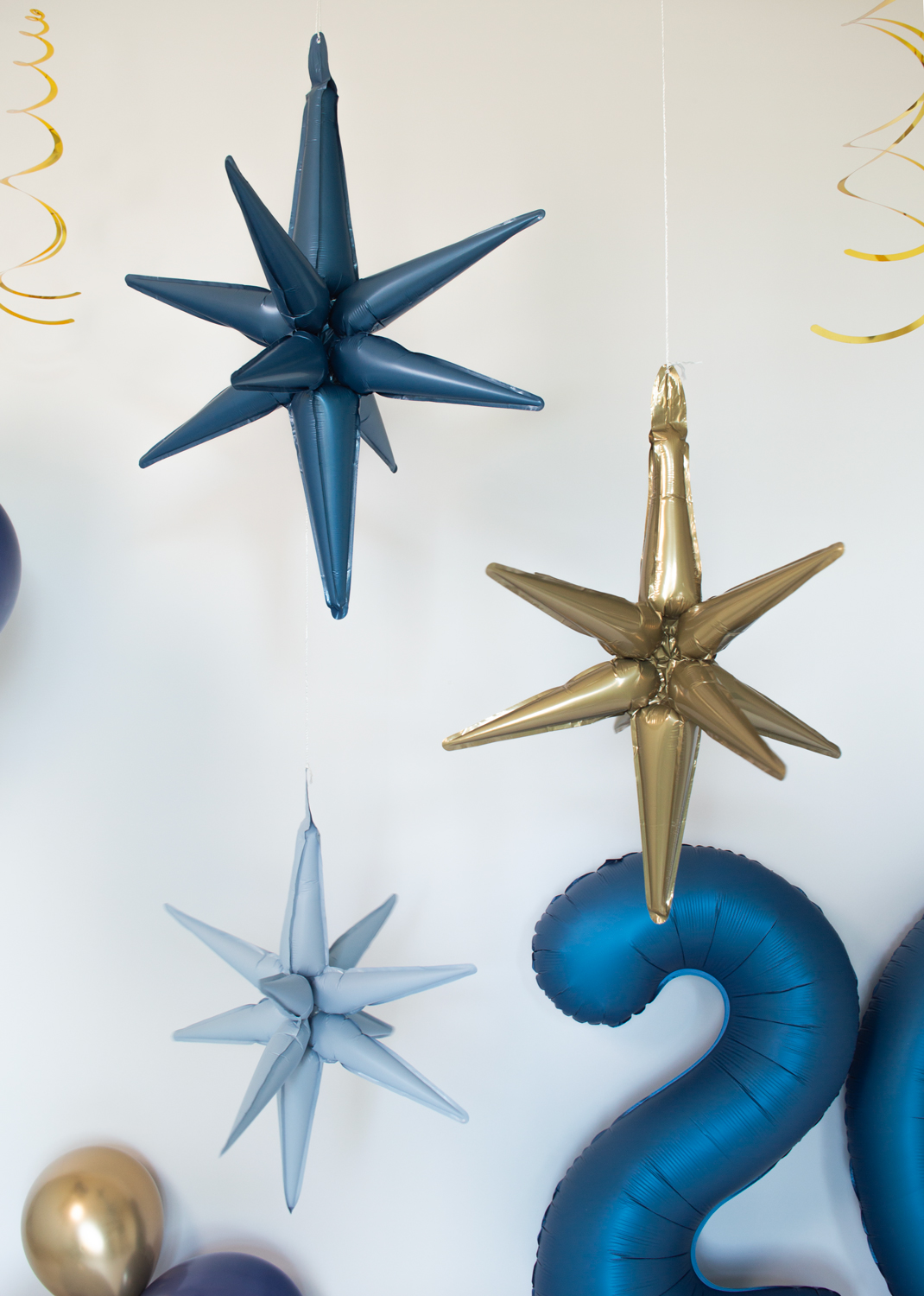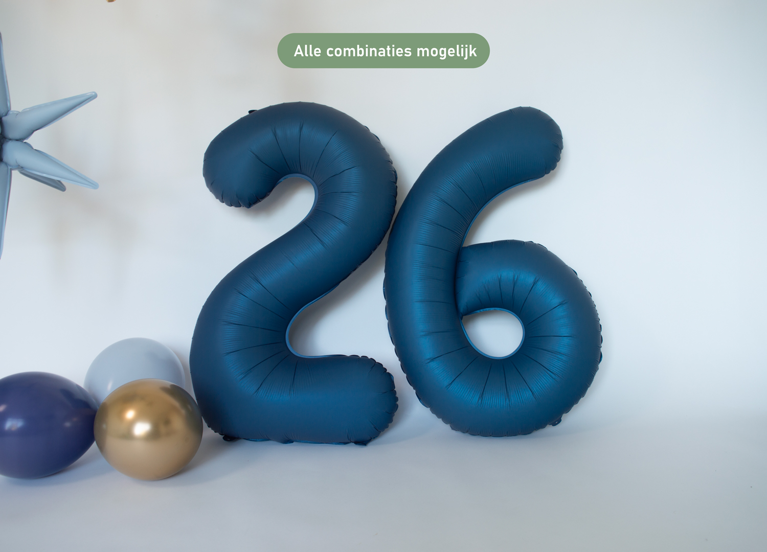 Een elegante Happy Birthday cake topper die direct een luxe detail toevoegt aan je taart of tafel. Een grote cijferballon in midnight blue, verkrijgbaar in elk gewenst nummer zodat het pakket geschikt is voor iedere leeftijd. Opvallende stervormige folieballonnen in verschillende formaten voor extra hoogte en diepte in je ruimte. Een zorgvuldig samengestelde mix van matte ballonnen in midnight blue, zachte blauwtinten en goud. Groot genoeg voor volume, strak genoeg voor een luxe uitstraling. Krullint om alles netjes af te werken. Lijmpuntjes waarmee je eenvoudig ballonnen combineert en speelse accenten creëert. Alles is al in verhouding samengesteld. Jij hoeft alleen nog te bepalen waar je het wilt ophangen.