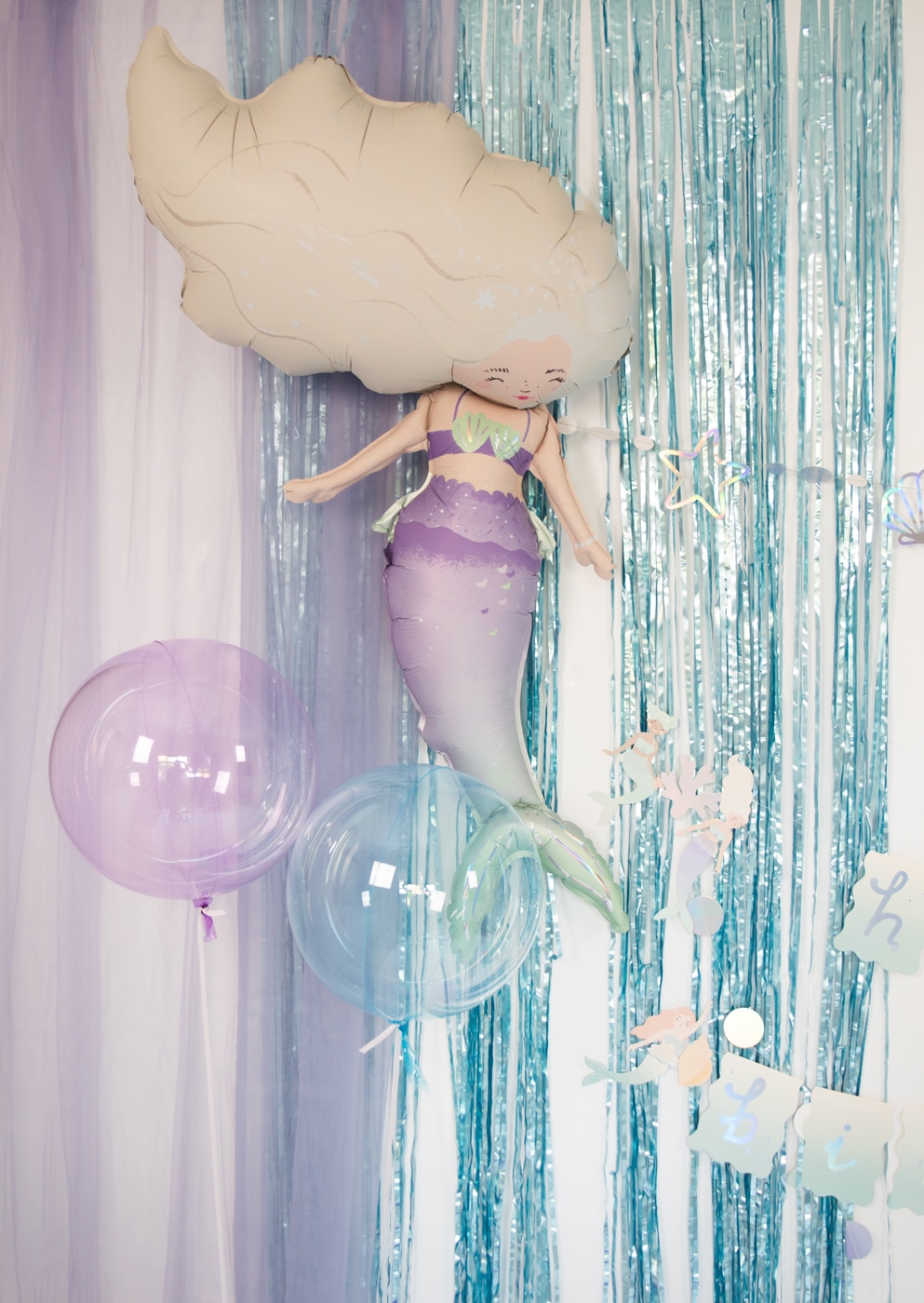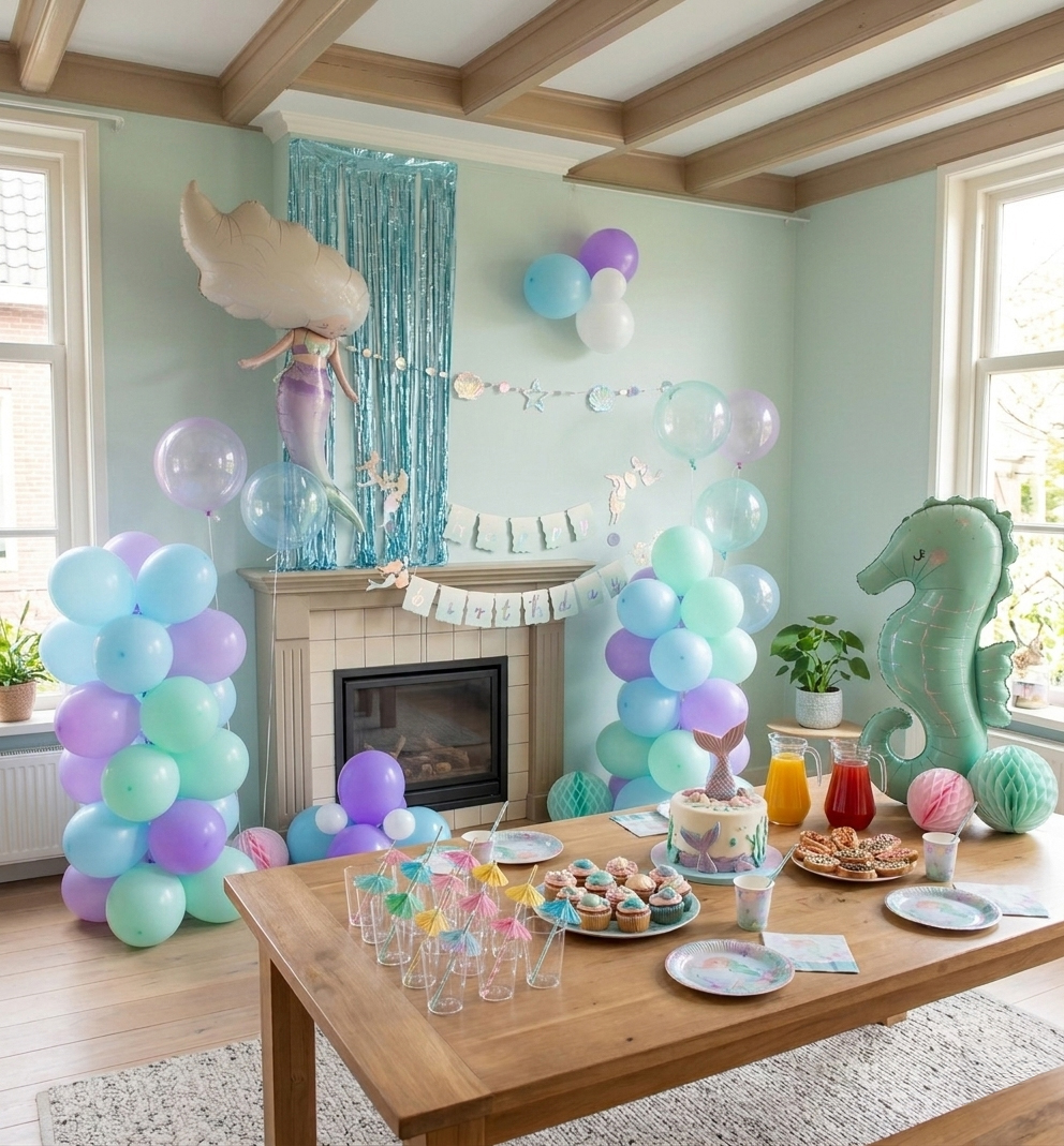 Zachte blauwtinten, paarse accenten en speelse zeemeermin details zorgen voor een frisse en opvallende uitstraling. De combinatie van matte ballonnen en themaballonnen geeft volume zonder dat het druk wordt. Het geheel voelt licht, rustig en in balans.